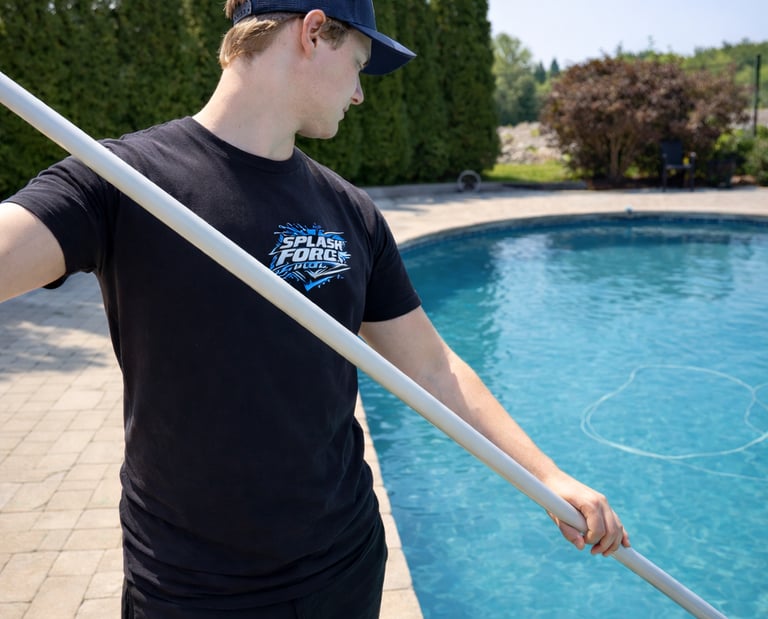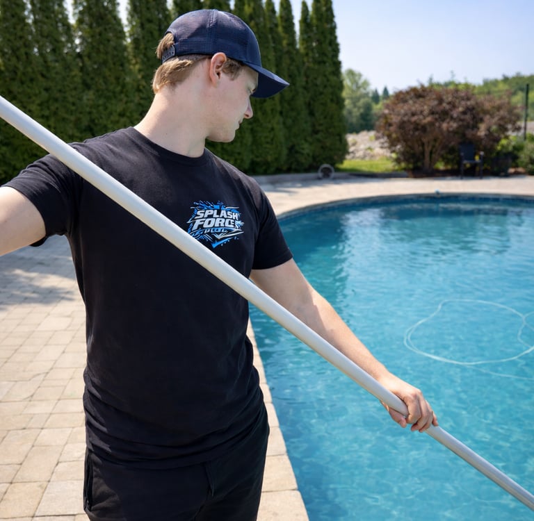 At Splash Force Pools, this is not just a walkthrough or a handout. It is a full professional pool cleaning where you shadow our technician step by step as we service your pool. During the visit, we show you exactly how to clean, balance, and maintain your pool while explaining your equipment, proper chemical use, and weekly care routines in real time.